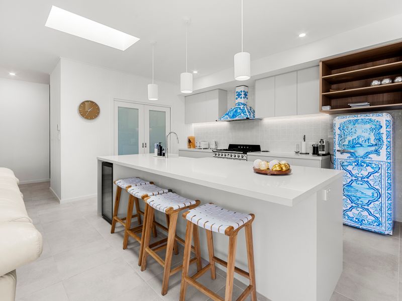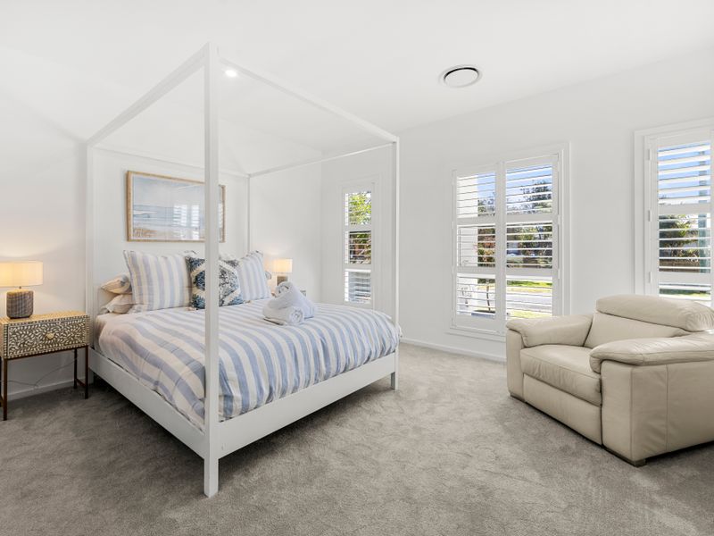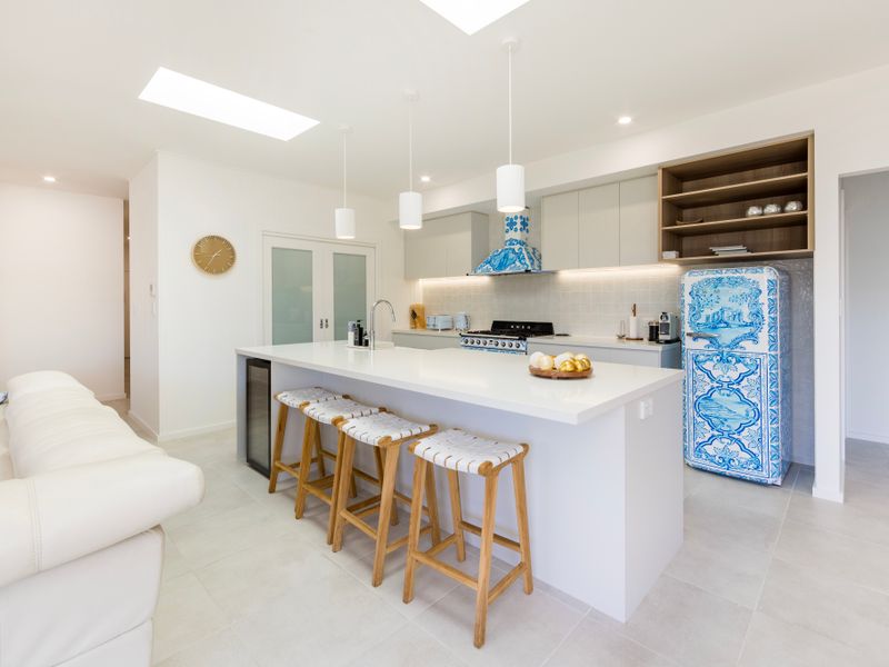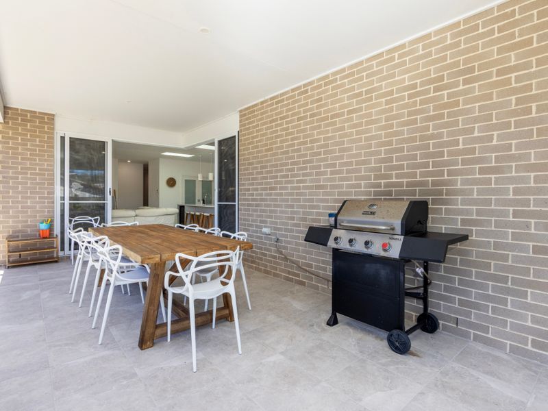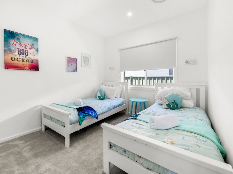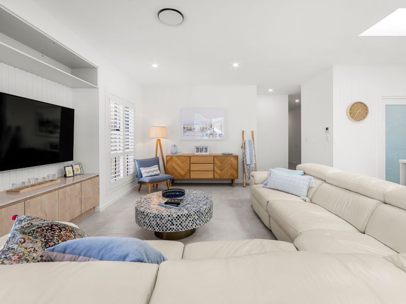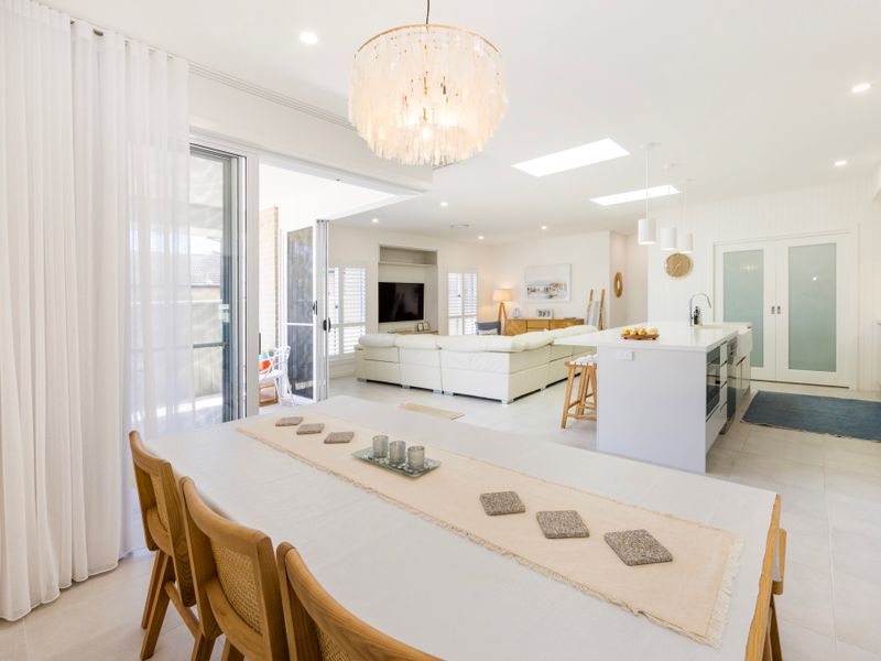 Escape the bustle and surrender to the rhythm of Jervis Bay at this bright, contemporary beach house — an effortless coastal base just a short 5-minute stroll to Callala Beach and Callala Bay (both part of Jervis Bay). Light, cool-tiled interiors flow from a generous designer kitchen (premium appliances, Smeg toaster & kettle, Nespresso, dishwasher, microwave, NutriBullet) into relaxed living areas and a separate media lounge that open to a covered alfresco dining and BBQ space — perfect for easy indoor–outdoor entertaining.