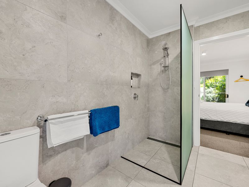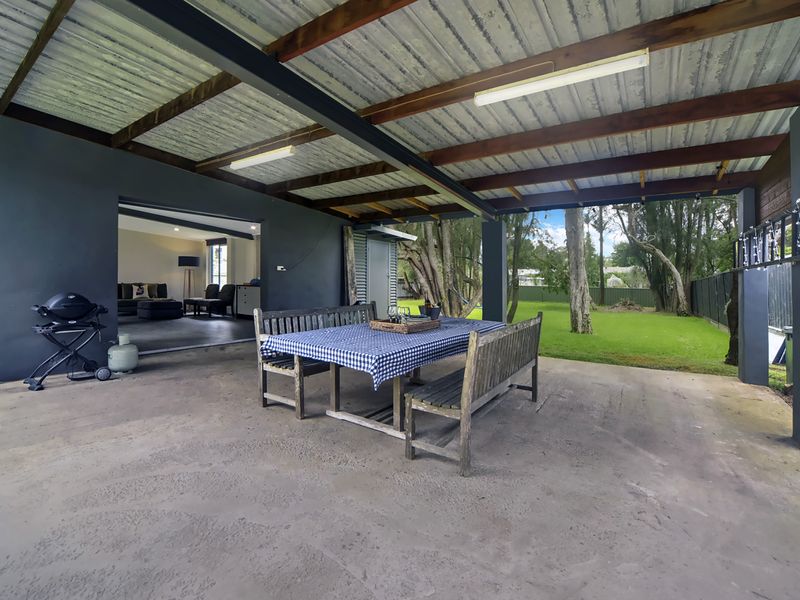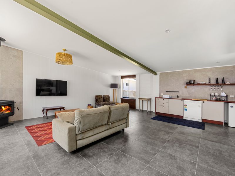 Inside, the vibe is warm and welcoming. The lounge centres on a cosy fireplace and flows into the dining and fully equipped kitchen (dishwasher, coffee machine) — simple, well appointed and handy for family meals. The bonus rumpus “down the back” is a real win for groups: comfy lounges with a wood burner, smart TV, a small kitchenette with bar fridge and dishwasher, and direct access to the undercover BBQ area where hammocks hang between Casuarinas for a proper lazy-afternoon feel.