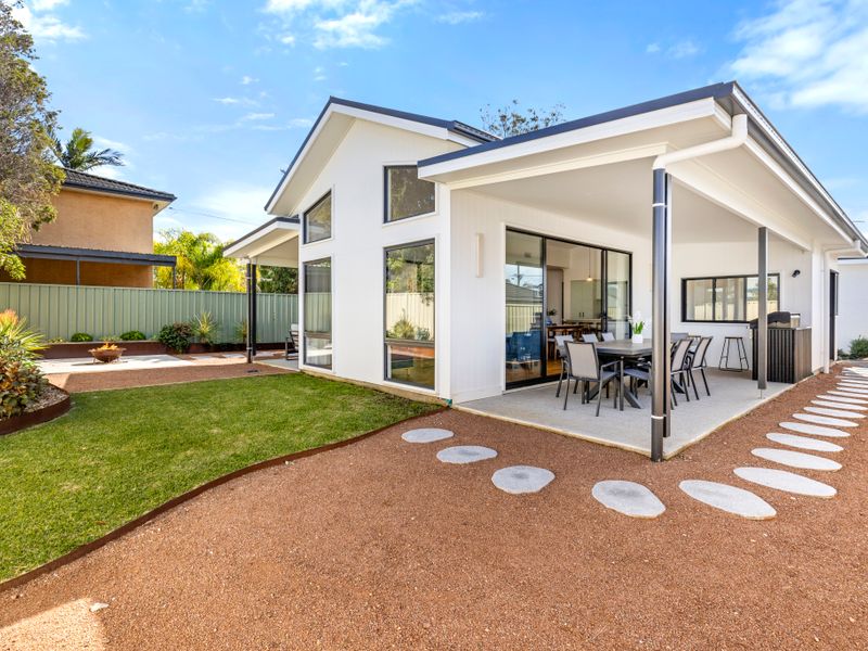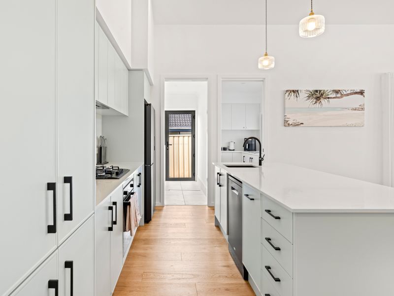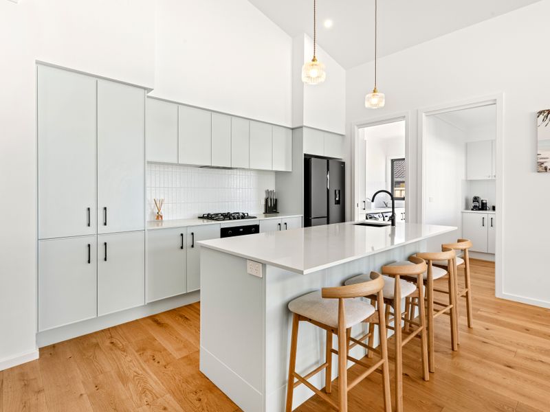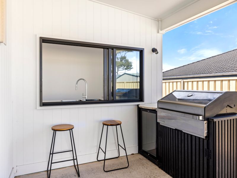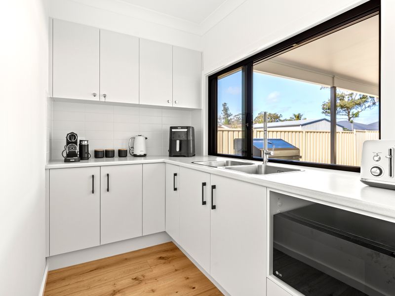 The well-equipped kitchen offers everything you need to prepare holiday feasts, from fresh-caught seafood dinners to relaxed breakfasts before heading out to explore. A convenient butler’s pantry provides extra space and functionality, featuring a large opening window with bar stools on the other side—perfect for serving drinks or snacks. Share meals around the dining table, or take your culinary creations outside to the alfresco setting, where you can soak up the coastal breeze in your private, fully fenced backyard.