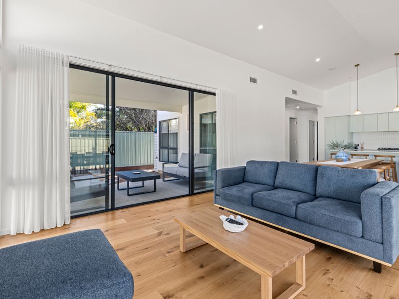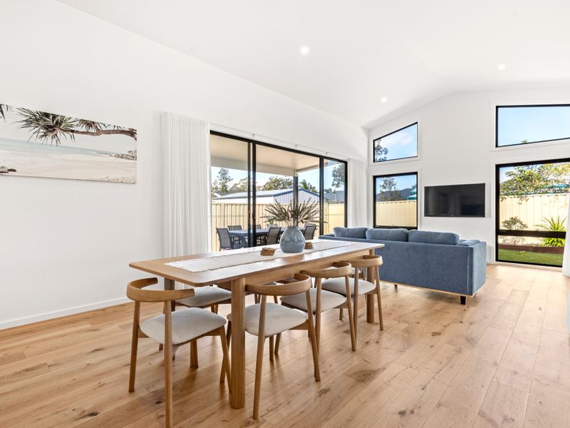 Step inside to find a light-filled haven designed for comfort and relaxation. The open-plan living and dining areas create a warm, inviting atmosphere—perfect for gathering with family and friends after a day of seaside adventures. Large windows invite the outdoors in, framing leafy garden views and filling the space with natural light.
