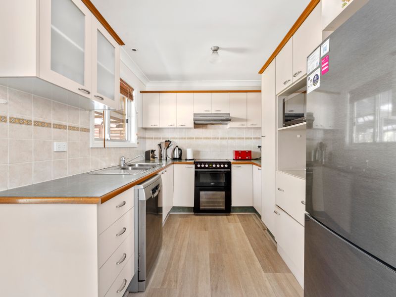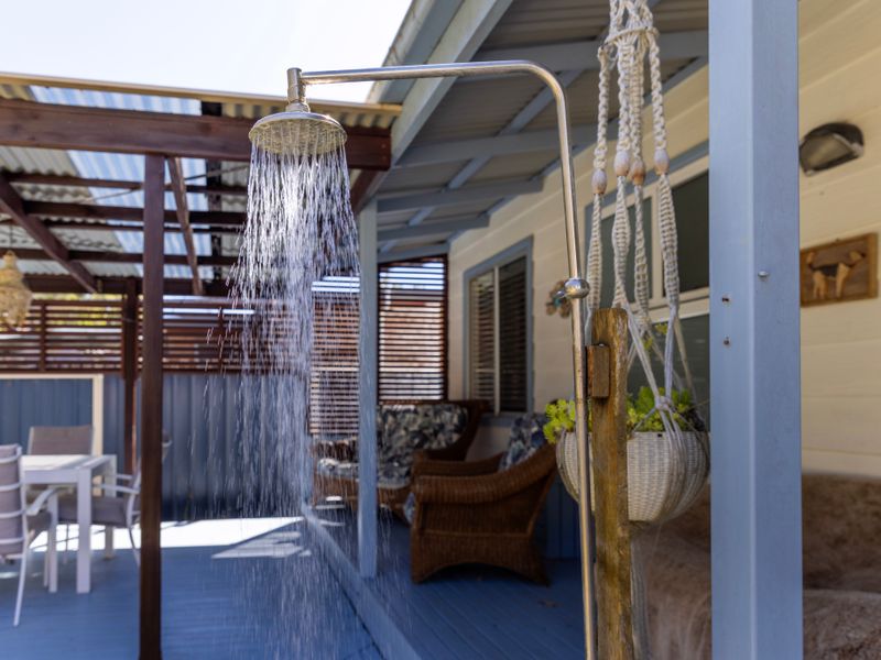 Inside, an L-shaped lounge and dining layout centres on comfort and simple living: ceiling fans keep things cool in summer and a gas heater adds warmth in winter. The living room features a brand-new LG 55-inch Cinema Series OLED smart TV with apps for Netflix, Stan and Amazon Prime. The well-equipped kitchen includes a microwave, coffee machine and dishwasher, and there’s an owner’s pantry of basic items you’re welcome to use (please replace if you empty anything).