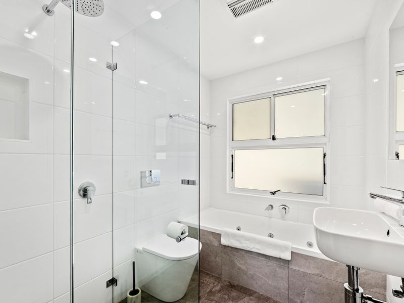 The bathroom has been recently renovated and features a jetted spa bath with a large window opening onto the backyard — perfect for a soak with a book and a glass of wine. Practical extras include a laundry with washing machine, dryer and an extra toilet, outdoor seating for six under the large covered patio, an outdoor shower and gas BBQ, a trampoline for the kids, along with a swing and off-street parking for three cars. The home sleeps up to six guests across three bedrooms.