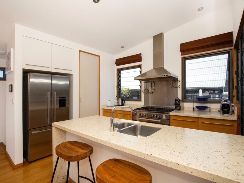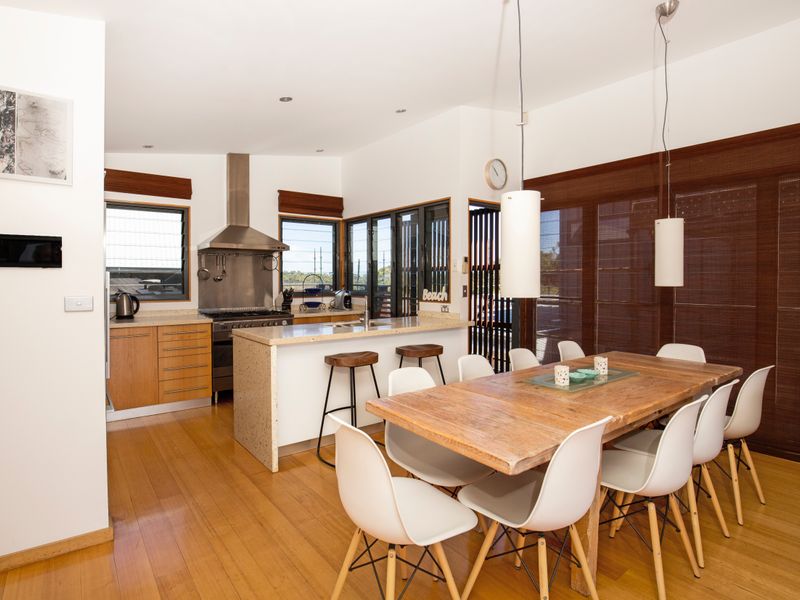 Shower off the sand in one of the two outdoor showers, and enjoy lunch cooked in the modern kitchen or out on the BBQ deck. After eating, the kids will be entertained in either of two entertaining areas with TV, DVDs, Netflix, a gaming console and board games, whilst the adults sink into relaxation across multiple outdoor decks. Grab some cold ones and the blutooth speaker and enjoy the spa directly outside the master bedroom, or get some privacy by taking a book out to one of the loungers or deck chairs closer to the beach.
