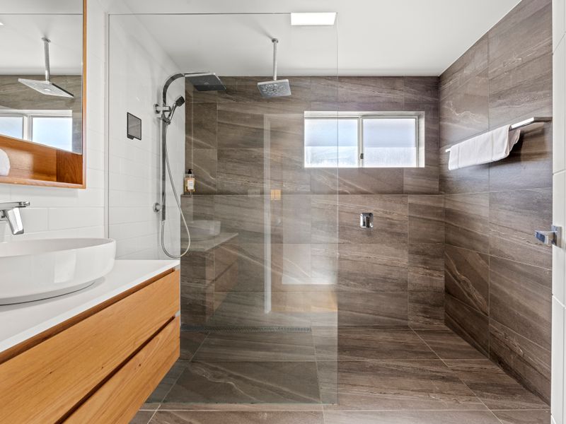 Every bedroom is a cozy retreat in itself, carefully curated with comfy furnishings and premium bed linens. Inside the house two bedrooms offer queen-sized beds and the third comes with a tri-bunk, whilst outside in bedroom 4 (accessed via the back deck) there is another queen bed making this a perfect fit for families, friends, or couples. (Please note there is no bathroom attached to the exterior bedroom four). The cherry on top is the luxurious en-suite bathroom in the master bedroom, offering a relaxing, private space.