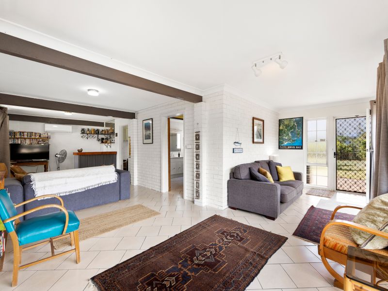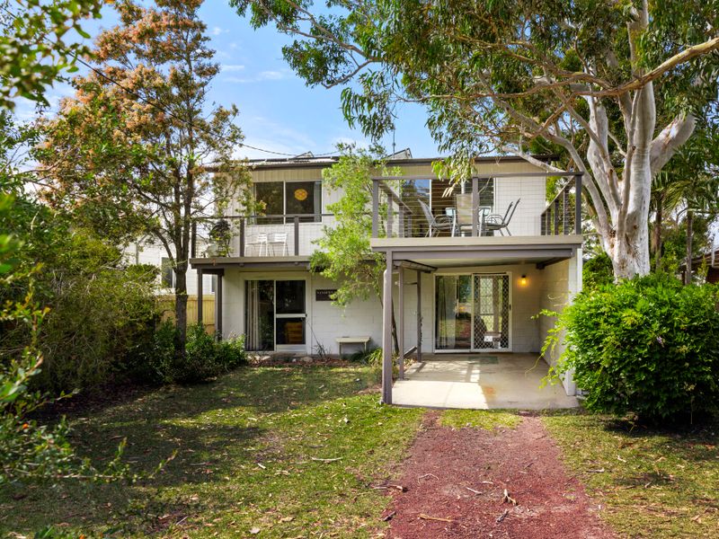 Inside, open-plan living and dining spill onto a large front deck where you can fire up the gas BBQ and dine under the trees. The kitchen is well equipped (microwave and coffee machine — bring your own Lavazza pods), and the house features comfortable lounging zones with a smart TV upstairs plus a separate downstairs bar area with an additional flat-screen TV and DVD player — ideal for movie nights or splitting into quiet and social zones. Practical extras include an outside laundry with an extra shower and toilet (great for rinsing sandy kids and dogs) and undercover parking with plenty of off-street space for boats and cars.