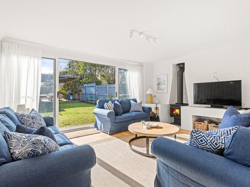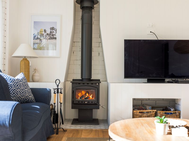 Inside, you’ll find breezy open-plan living filled with natural light, where a glass sliding door opens up to let the sea breeze flow through, instantly putting you in holiday mode. Curl up by the crackling indoor fireplace on cooler evenings, or unwind with a good book and a glass of wine as the coastal air drifts in, with a kitchen that is fully equipped for effortless holiday cooking, and the indoor and outdoor dining areas make every meal a moment to savour.